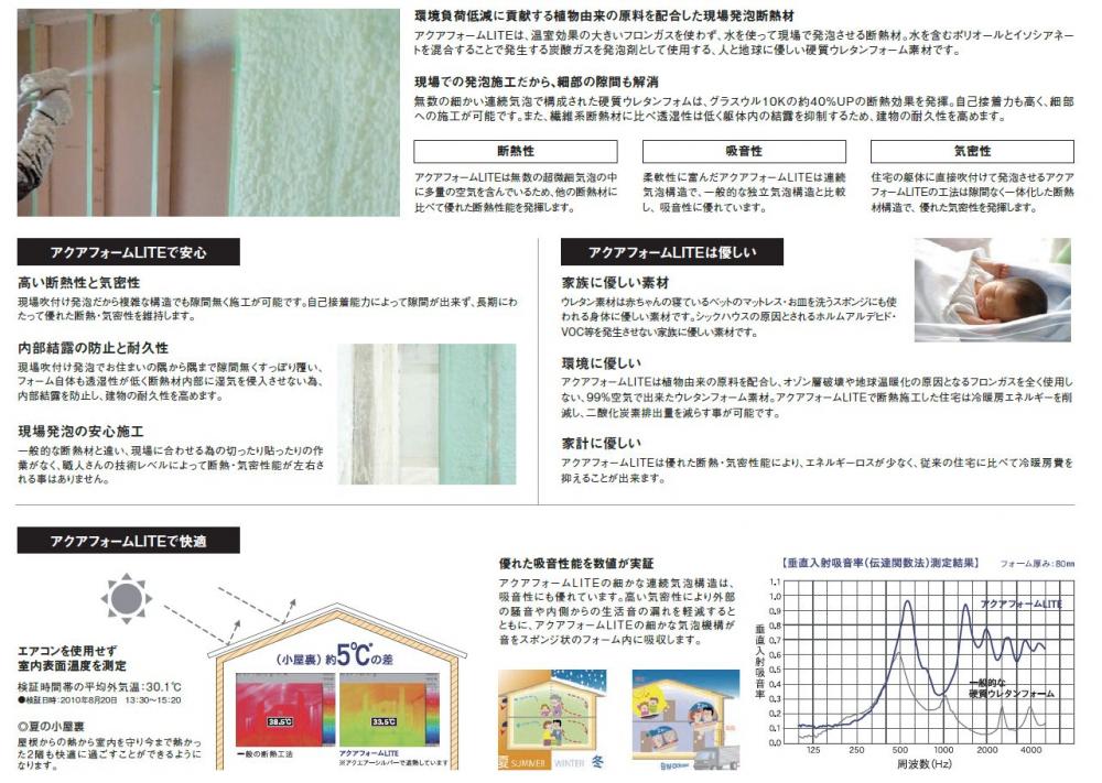 お住まいいただく方が快適に生活していただけるよう外壁は16mmサイディング、安心・快適・優しい断熱材アクアフォームLITEを採用